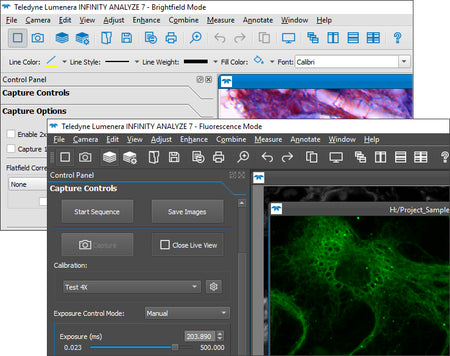 INFINITY ANALYZE software provides powerful tools for image acquisition, measurement, annotation, and analysis, delivering a complete microscopy imaging solution without recurring license fees. The software includes calibration tools, measurement functions, image enhancement capabilities, and export options for documentation and reporting. This comprehensive software package eliminates the need for additional imaging software purchases.